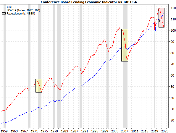 Aber ein Indikator übertrifft sie derzeit alle – in negativer Hinsicht. Die Rede ist von einem der renommiertesten Konjunkturindikatoren – dem Leading Economic Indicator (LEI) des Conference Board (CB). Dieser tanzt aus der Reihe und zeigt weiterhin unbeirrt eine Rezession in den USA an: