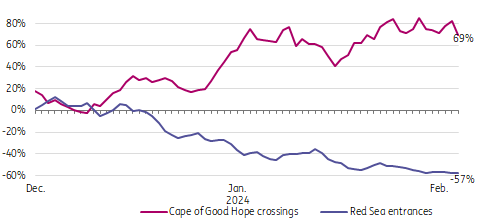 Die ING Bank hat vorgestern eine Einschätzung dazu abgegeben, wie stark sich die Probleme im Roten Meer auf die Inflation auswirken könnten. Seit nunmehr zwei Monaten werden dort immer wieder Angriffe auf Schiffe gemeldet. Und deshalb mieden Anfang Februar 57 % der Frachter das Rote Meer. Stattdessen nehmen sie den Umweg um Südafrika herum.