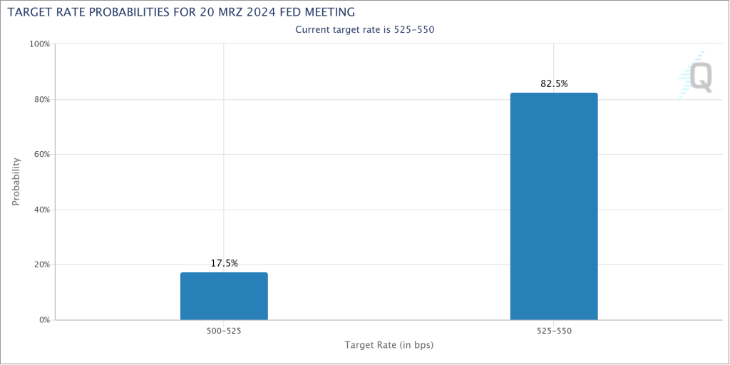 Eine erste Zinssenkung der US-Notenbank im März wird laut dem Fed-Watch-Tool der CME inzwischen nur noch mit einer Wahrscheinlichkeit von 17,5 % gesehen.