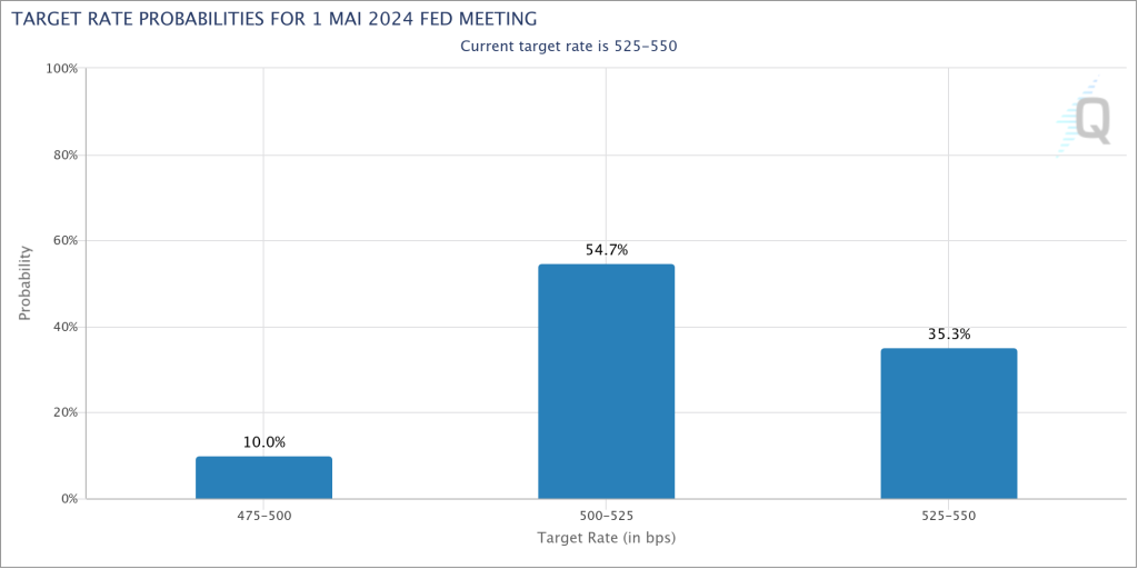 Zum Vergleich: Am 16. Januar waren es noch 63,3 % für März. Und mit 62,5 % war sogar schon eine zweite Zinssenkung im Mai eingepreist (siehe dazu auch „Erste Leitzinssenkungen erst im Juni? – Egal?“).