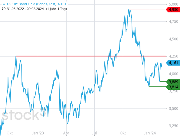 Die veränderten Markterwartungen spiegeln sich vor allem an den Rentenmärkten wider. Die Rendite der 10-jährigen US-Staatsanleihen scheint Ende 2023 ein Tief gefunden zu haben. Zwar gab es in der vergangenen Woche noch einen scharfen Rücksetzer, dieser endete aber auf einem höheren Tief und wurde schnell vollständig aufgeholt.
