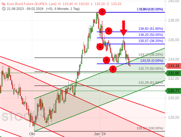 Da der Bund-Future in den Aufwärtstrendkanal (grün) zurückgefallen ist, wenn auch bislang nur knapp, gehe ich davon aus, dass sich die Kurse nun innerhalb dieses Trendkanals einpendeln und in die erwartete Seitwärts- bzw. moderate Aufwärtstendenz einschwenken werden. Zumal durch das neue Korrekturtief nun das 50%-Fibonacci-Retracement der Aufwärtsbewegung seit Anfang Oktober bei 132,73 Punkten die nächste Anlaufmarke ist.