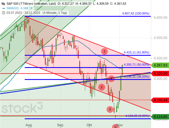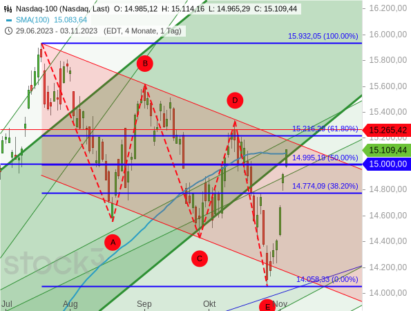 Und auch der Nasdaq 100 hat bereits das 50%-Fibonacci-Retracement seiner Korrekturbewegung erreicht.