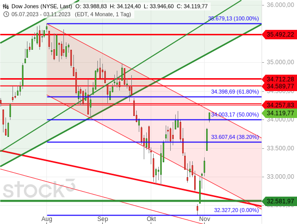 Der Dow Jones hat dadurch inzwischen binnen nur 5 Handelstagen schon mehr als 50 % der gesamten Kursverluste aufgeholt, die er seit dem Beginn der Korrektur vom 1. August und somit in fast 3 Monaten angehäuft hatte.