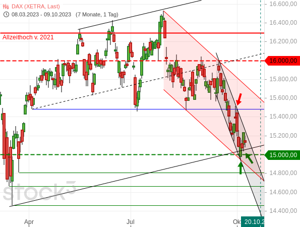 Denn mit diesem Tief ist der DAX nicht nur an der Unterkante zweier Abwärtstrends (rot, schwarz) angekommen, sondern auch an der runden 15.000-Punkte-Marke sowie an der Unterkante eines breiten Aufwärts- bzw. Konsolidierungskanals (schwarze Linien). Er hat also eine massive Unterstützungszone erreicht und dort bereits in der Vorwoche wieder nach oben gedreht.