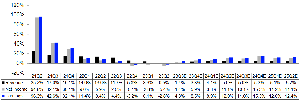 Vergleicht man dies nun nicht mit langjährigen Durchschnittswerten, sondern mit den Analystenschätzungen, über die ich in der Börse-Intern vom 24. August berichtet hatte (siehe folgende Tabelle – Achtung, die Spalten sind verschoben!), dann verläuft die Berichtssaison immerhin besser als erwartet. Dann vor etwas mehr als zwei Monaten hatten die von Refinitiv bzw. LSEG beobachteten Analysten lediglich mit einem Gewinnanstieg von 1,3 % und einem Umsatzanstieg von 0,5 % gerechnet.