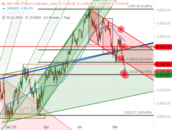 Und wie am Dienstag für diesen Fall bereits geschrieben (siehe „Die neuen Korrekturtiefs sind da! Und jetzt?“), muss man nun verstärkt damit rechnen, dass die untere Linie des breiten Aufwärtstrendkanals angesteuert wird, die derzeit zwischen 3.900 und 4.000 Punkten verläuft. Allerdings kann man zuvor immer noch auf das 61,80er Retracement bei 4.116,02 Punkten als möglichen Halt hoffen.