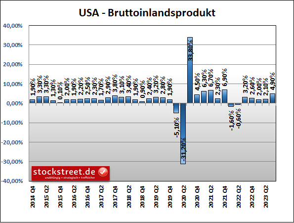 Während vorgestern viele Augen auf die Europäische Zentralbank (EZB) gerichtet waren, wurden zwischen dem Zinsentscheid und der Pressekonferenz die Daten zum Bruttoinlandsprodukt (BIP) der USA veröffentlicht. Und diese fielen überraschend positiv aus. Mit einem Anstieg um 4,3 % hatten Experten im Durchschnitt bereits gerechnet, nach +2,1 % im 2. Quartal 2023. Tatsächlich wuchs die größte Volkswirtschaft der Welt aber von Juli bis September auf das Jahr hochgerechnet (annualisiert) sogar um 4,9 %, wie das US-Handelsministerium nach einer ersten Schätzung mitteilte.