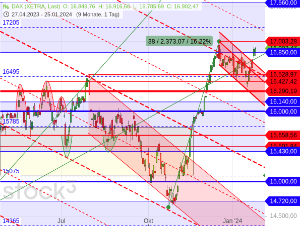 Da auch die Rechteckgrenze überwunden wurde, ist aus Sicht der Target-Trend-Methode die Mittellinie bei 17.205 Punkten wieder als Kursziel erreichbar. Auf dem Weg dorthin muss der DAX allerdings vor dem Hoch vom 14. Dezember auch noch das tiefere Hoch vom 2. Januar überwinden. Erst wenn beide Hürden überwunden sind, kann man mit hoher Wahrscheinlichkeit davon ausgehen, dass dem Index der Anstieg über die Rechteckgrenze in diesem Anlauf nachhaltig geglückt ist – vorerst.