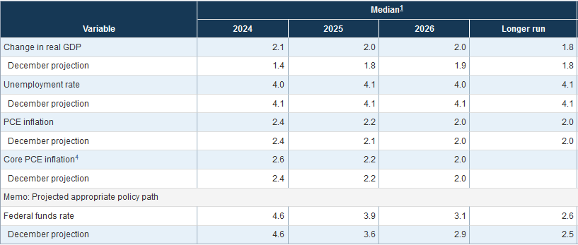 Die Anleger am Aktienmarkt haben sich wohl stattdessen darauf fokussiert, dass die Erwartungen an das Wirtschaftswachstum von der Fed nach oben revidiert wurden, vor allem für das laufende Jahr. Statt eines Anstiegs des Bruttoinlandsprodukts (BIP, englisch: GDP) um 1,4 % sollen es nun 2,1 % sein. Dabei wird die Arbeitslosigkeit kaum ansteigen, sondern bei rund 4 % auf historisch niedrigem Niveau verbleiben. Und die Inflation soll sich bis 2026 kontinuierlich in Richtung 2 %-Ziel der Fed bewegen.