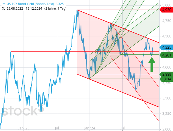 Die Rendite der vom Markt vielbeachteten 10-jährigen US-Staatsanleihen hat daher an einer horizontalen Unterstützung nach oben gedreht (siehe grüner Pfeil im folgenden Chart).