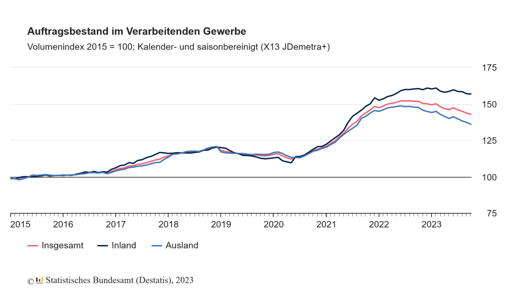Die Reichweite des Auftragsbestands sank im Oktober auf 6,9 Monate. Das ist das niedrigste Niveau seit knapp 3 Jahren.