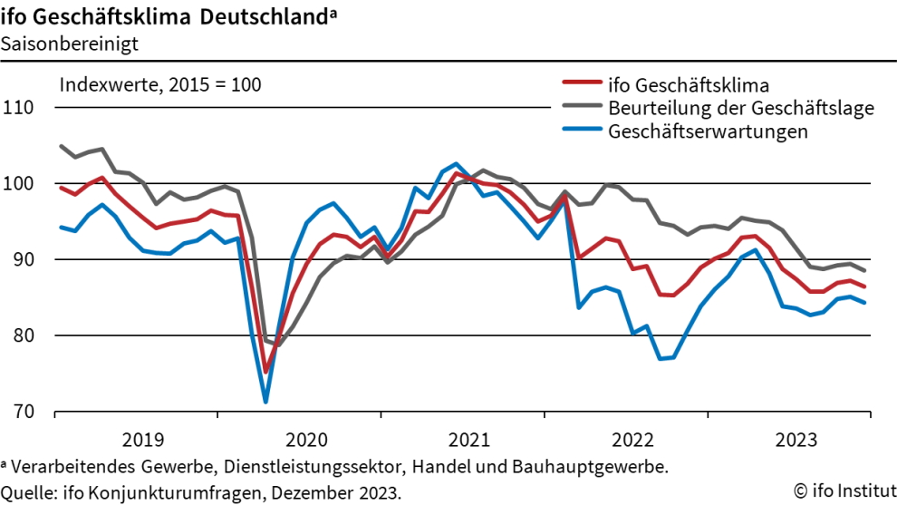 Die deutsche Wirtschaft wird angesichts dieser Daten mit hoher Wahrscheinlichkeit im Schlussquartal 2023 geschrumpft sein und somit in einer technischen Rezession stecken. Denn im vorangegangenen Vierteljahr war das Bruttoinlandsprodukt (BIP) bereits um 0,1 % zurückgegangen. Und es sieht derzeit nicht danach aus, als würde die Wirtschaft Anfang 2024 besser abschneiden.