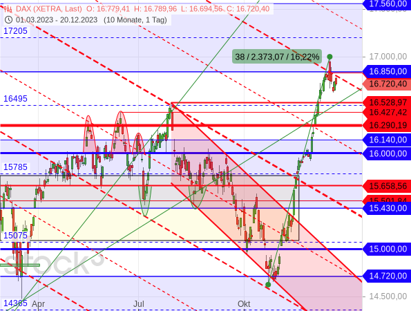 Und so passt es zumindest ins Bild, dass der DAX seit der Zinsentscheidung der EZB vom vergangenen Donnerstag nicht weiter zulegen konnte. Stattdessen stellte sich der Anstieg über die Rechteckgrenze bei 16.850 Punkten als Fehlausbruch heraus und die Kurse sind entlang einer Konsolidierungslinie (rot gestrichelt) in eine kleine Rally-Pause übergegangen – was aus Sicht der Target-Trend-Methode idealtypisch ist.