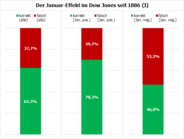 Die deutlich unterschiedliche Verteilung von positiven und negativen Fällen deutet ebenso wie die nach oben verschobene Regressionsgerade auf einen systematischen Fehler hin. Dieser ist auch recht offensichtlich: Die Aktienmärkte – also auch der Dow Jones – steigen in den meisten Jahren. Daher ist es auch bei einem negativen Jahresstart wahrscheinlicher, dass der Index das Jahr im Plus beschließt! Und genau das zeigt die Statistik auch. Nutzbare Erkenntnisse bringt sie somit nicht.