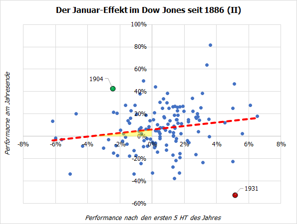 Zudem bestätigt die rote Regressionsgerade die Gesamtstatistik aus der vorangegangenen Grafik: Sie ist aus dem Schnittpunkt der beiden Achsen nach oben verschoben, so dass sie bei niedriger negativer Performance zu Jahresbeginn immerhin noch ein kleines Plus für das Gesamtjahr verheißt (siehe gelb markierter dreieckiger Bereich).