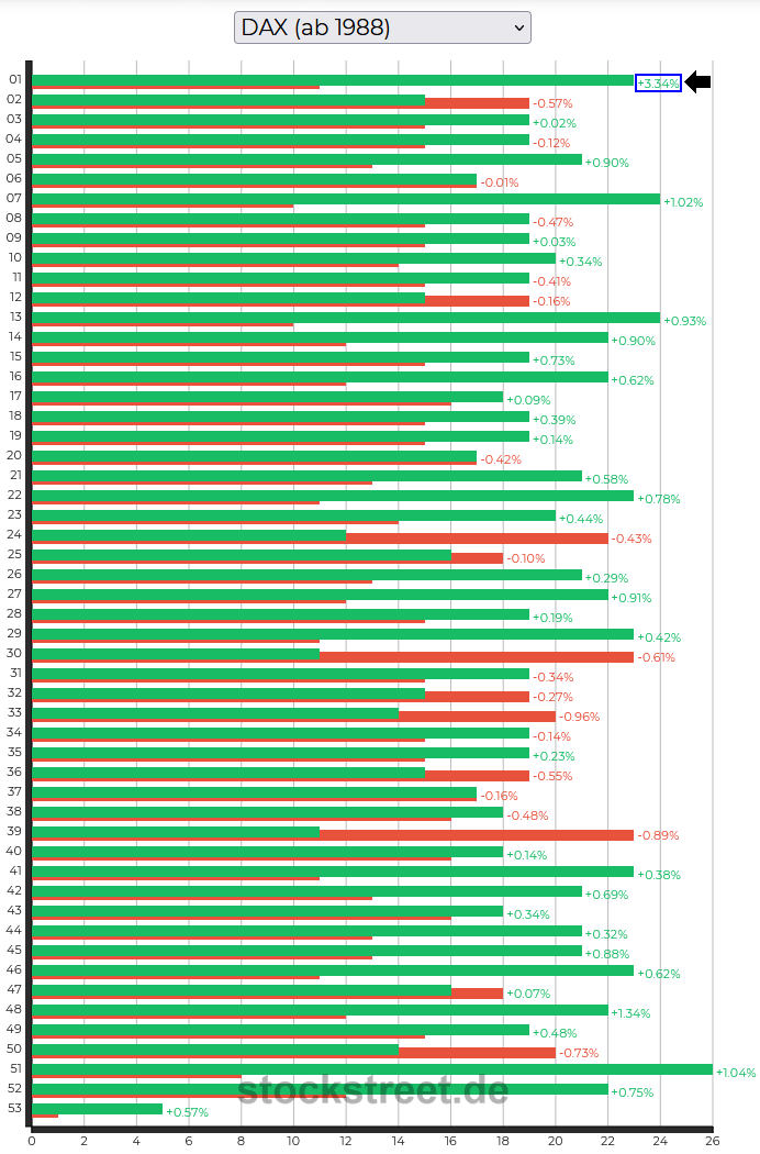 In der ersten Woche eines Jahres (siehe Pfeil) steigen die Kurse auch im DAX überdurchschnittlich oft – das zeigt die Länge des grünen Balkens: Es gibt nur 3 Wochenbalken, die länger, und 4, die gleich lang sind. Noch deutlicher ist aber die durchschnittliche Performance dieser ersten Woche: Mit 3,34 % ist sie mit Abstand der größte Wert!