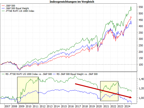 Die Outperformance von Indizes, die nach Marktkapitalisierung gewichtet sind, ist allerdings kein Naturgesetz! Es gibt auch längere Zeiträume, in denen z.B. die Equal-Weight-Variante die Nase vorn hatte (unter anderem von 2004 bis 2007). Doch diese Wechsel in der Gunst der Anleger zu erkennen und zu nutzen, ist für die meisten ein ähnlich aussichtsloses Unterfangen wie langfristiges Timing.