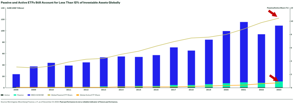 Es ist auch nicht so, dass der „Superboom“ der ETFs die aktiven Anleger verdrängen würde. Dafür müsste das Kapital, das in ETFs steckt, eine signifikante Größenordnung erreichen, was aber noch lange nicht der Fall ist. Dazu eine kleine Abschätzung: