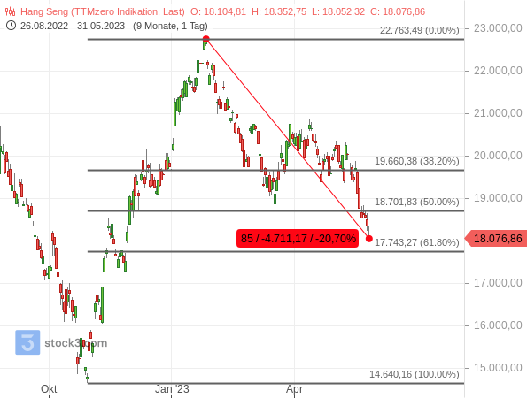 Und das spiegelt sich auch in den Aktienkursen wider. Der chinesische Aktienindex Hang Seng befindet sich seit einem Hoch von Ende Januar im Rückwärtsgang. (Dabei hat er inzwischen ein Fünftel an Wert eingebüßt.) Zuvor hatte er sich von einem Tief, das Ende Oktober vergangenen Jahres markiert wurde, kräftig erholt. (Diese Erholung hat er nun um fast 61,80 % korrigiert.)