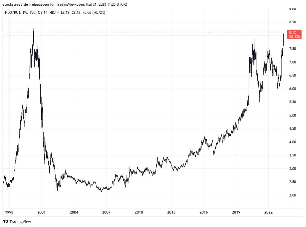 Und das Verhältnis zwischen dem Technologieindex Nasdaq 100 und dem Nebenwerteindex Russell 2000 ist inzwischen wieder so übertrieben wie zu Zeiten der Dotcom-Blase im Jahre 2000.