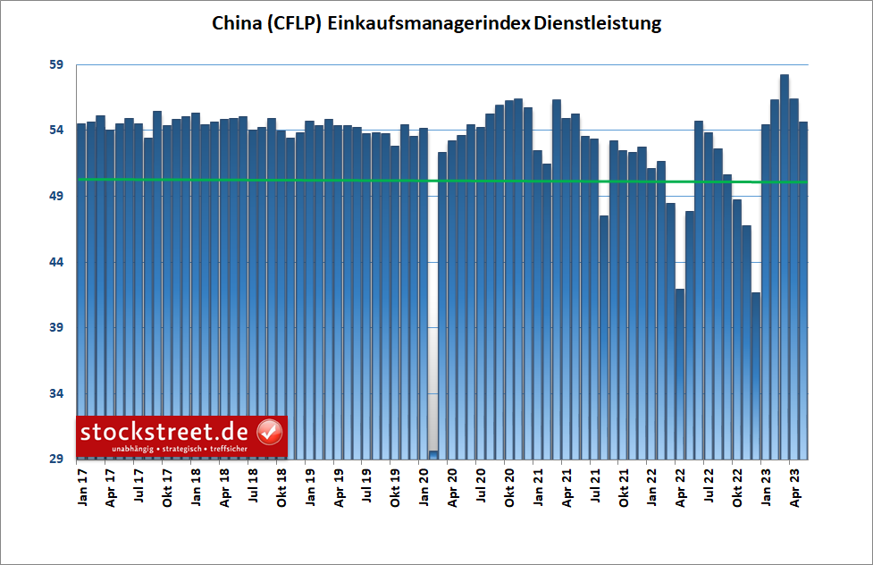 Das nicht verarbeitende Gewerbe verlor im Mai ebenfalls erneut an Schwung. Der offizielle PMI für den Dienstleistungssektor fiel von 56,4 im April auf 54,5.