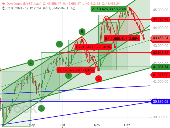 Außerdem fielen die beiden vorangegangenen Rücksetzer mit -3,48 % und -3,87 % in etwa gleichgroß aus wie der aktuelle. Und schon bei der ABC-Korrektur von Ende Oktober war der Dow Jones aus seinem steilen Aufwärtstrendkanal nach unten ausgebrochen, was sich aber wenig später als Bärenfalle entpuppte. Und da nach 8 (bzw. mit dem gestrigen Tage sogar 9) Verlusttagen in Folge eine Gegenbewegung fällig ist, könnte auch dieses Mal eine schnelle Rückeroberung des steilen Trendkanals gelingen.