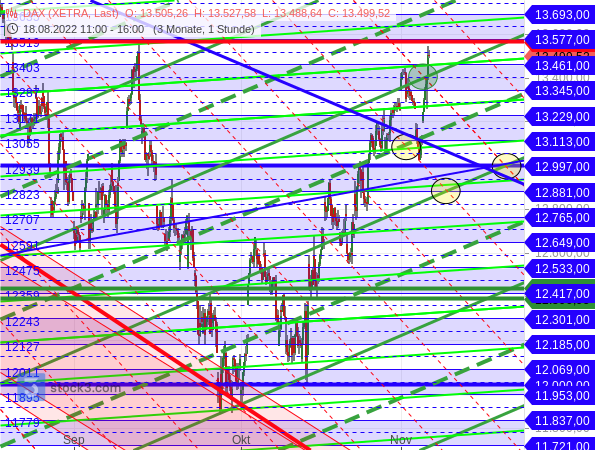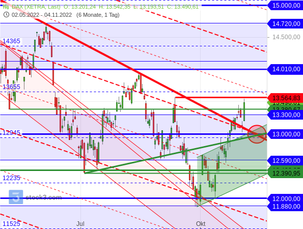 Da der DAX bei 13.564,83 Punkten auf das markante Zwischenhoch vom 13. September trifft (dicke rote horizontale Linie), ist es allerdings durchaus denkbar, dass es erneut zu einem Rücksetzer kommt und die gelben Targets den Index doch noch einmal anziehen. In diesem Fall könnte auch das rote Target im Tageschart erreicht werden.