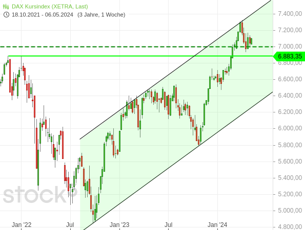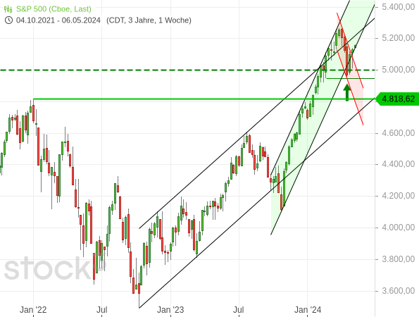Es gibt zwei herausragende Niveaus: die runde 5.000-Punkte-Marke und das alte Allzeithoch von Anfang 2022 bei 4.818,62 Punkten. Außerdem gibt es zwei markante Aufwärtstrends: den übergeordneten seit dem Tief im Herbst 2022 und den mittelfristigen, der den Kurs seit dem Herbst 2023 steil nach oben geführt hat. Beide Trends wurden zwischenzeitlich mal verlassen – der große nach oben und unten, der steile in der jüngsten Korrektur (nennen wir sie mal so) nur nach unten. In beide Trends ist der S&P 500 inzwischen wieder zurückgekehrt. Sie sollten daher fortgesetzt werden.