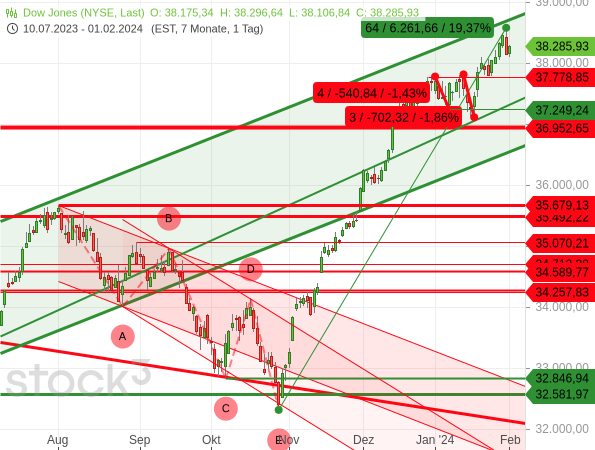 Noch verrückter ist es allerdings, dass der Dow Jones seit dem 27. Oktober um fast 20 % zulegen konnte, in diesen mehr als 3 Monaten aber nur 2 nennenswerte Rücksetzer über mehrere Tage erlebte (siehe folgender Chart). Diese fielen dabei jeweils auch nur relativ klein und kurz aus. Und beide fanden erst Anfang 2024 statt, nachdem also der Dow Jones fast 2 Monate lang nahezu ununterbrochen gestiegen ist.