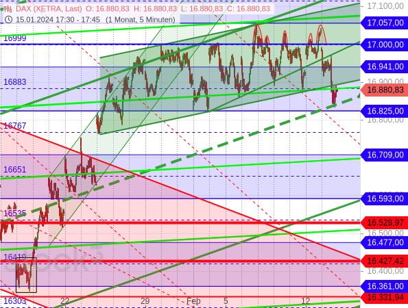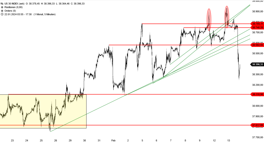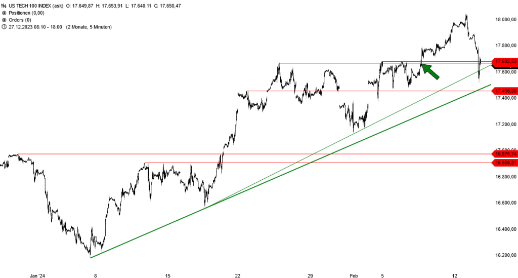 Ein flacher Aufwärtstrendkanal, der sich seit dem 24. Januar ausgebildet hat (grün), wurde damit nach unten verlassen. Und bei einer Kurserholung blieben die Kurse unterhalb des gebrochenen Trendkanals. Daher liegt hier nun – im Gegensatz zu den US-Indizes, aber auch zum Beispiel zum Euro STOXX 50 – bereits ein sehr bearishes Signal im kurzfristigen Bereich vor.