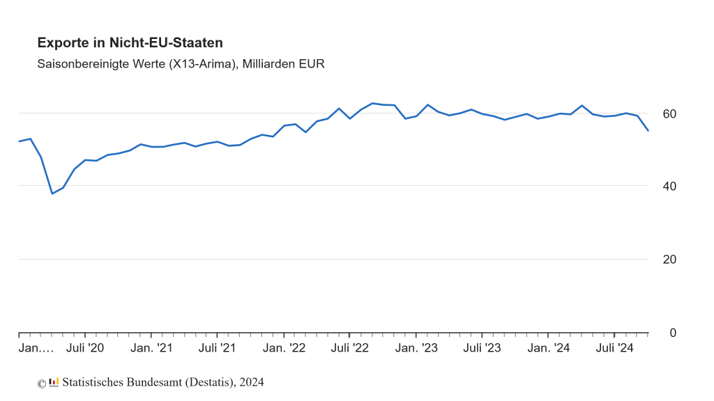 Dieser wurde aber gleich wieder getrübt durch die Meldung, dass die deutschen Exporte in Länder außerhalb der Europäischen Union zu Beginn des 4. Quartals 2024 eingebrochen sind. Sogenannte Drittstaaten haben im Oktober nur noch Waren aus Deutschland im Wert von 55,1 Milliarden Euro bezogen, 6,9 % weniger als im Vormonat. Im Vergleich zum Vorjahresmonat sind es -2,5 %.