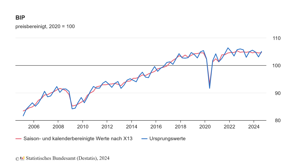 Dass der Anstieg des Bruttoinlandsprodukts (BIP) im 3. Quartal 2024 laut aktuellen Zahlen nur +0,1 % beträgt, statt zuvor gemeldeter +0,2 %, macht die Sache vor diesem Hintergrund kaum noch schlimmer (2. Quartal: -0,3 %, 1. Quartal: +0,2 %).
