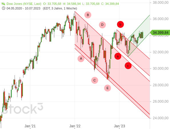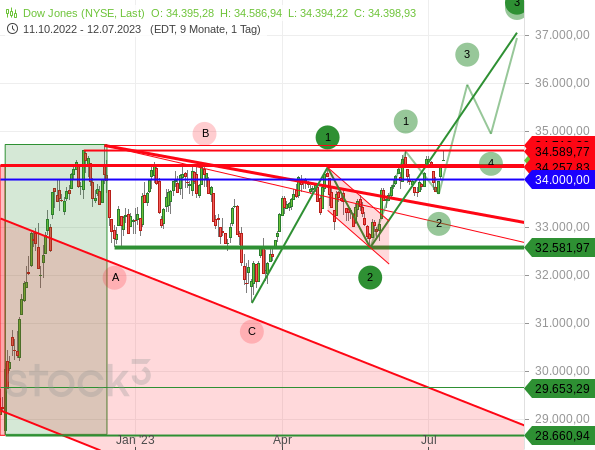 Fällt der Dow Jones hingegen unter die Tiefs der jüngsten abc-Korrektur (33.705 bzw. 33.610 Punkte), wäre das ein bearishes Signal, weil dann das bullishe Elliott-Wellen-Szenario in der hier dargestellten Form hinfällig wäre.