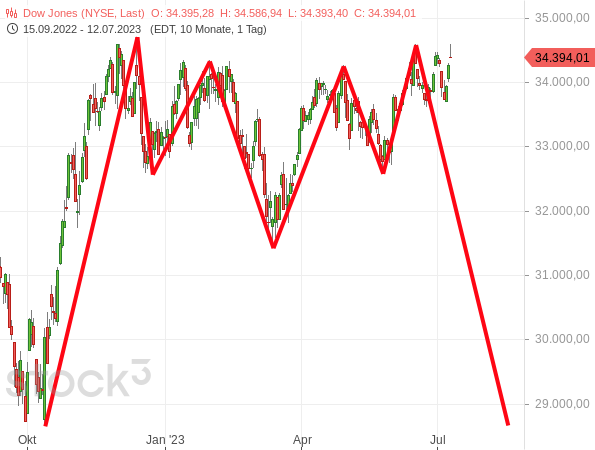Das wäre wohl die bearishste Variante. Demnach wäre die Kurserholung des Dow Jones lediglich eine Gegenbewegung im Bärenmarkt gewesen. Und die aktuelle Seitwärtstendenz würde eine Art Doppeltop (auch M-Formation genannt) ausbilden.