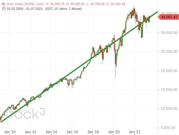 In diesem Monatskerzen-Chart ist zu sehen, dass sich der Dow Jones in einem langfristigen Aufwärtstrend befindet. Insofern ist grundsätzlich mit weiter steigenden Kursen zu rechnen. Das ist allerdings keine große Überraschung, weil Aktienmärkte langfristig eigentlich immer steigen. Insofern lässt sich immer eine Aufwärtslinie einzeichnen, deren Steigung lediglich variiert.