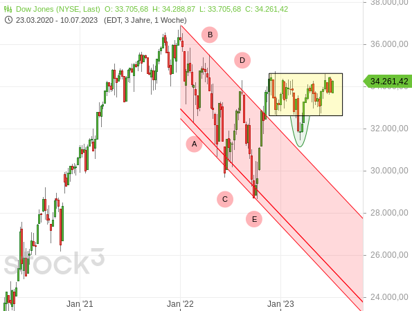 Allerdings stößt mir auch unangenehm auf, dass sich das Kursgeschehen seit dem ersten Aufwärtsimpuls (grünes Rechteck), also seit dem 13. Dezember 2022, recht lange hinzieht. Dauerte der Aufwärtsimpuls nur 42 Handelstage, so ist es dem Dow Jones seitdem an 142 Handelstagen nicht gelungen, auf ein neues Trendhoch zu steigen. Es fehlt also an Aufwärtsdynamik. Und daher macht der Dow Jones nach 7 Monaten auch eher den Eindruck einer Seitwärtstendenz.