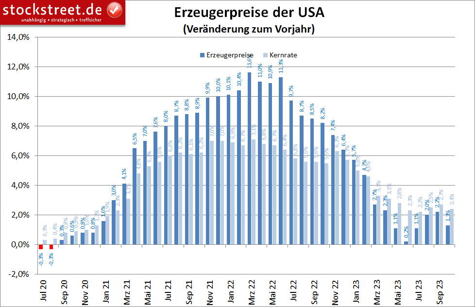 Die US-Erzeugerpreisdaten für Oktober haben gestern die Markterwartungen deutlicher übertroffen als die vorgestrigen Verbraucherpreise. Denn der Erzeugerpreisindex fiel um -0,5 % zum Vormonat, während Analysten im Durchschnitt mit einem Anstieg um 0,1 % gerechnet hatten, nach +0,4 % im September. Die Jahresrate gab dadurch auf nur noch +1,3 % nach, statt erwarteter +1,9 % (September: +2,2 %).