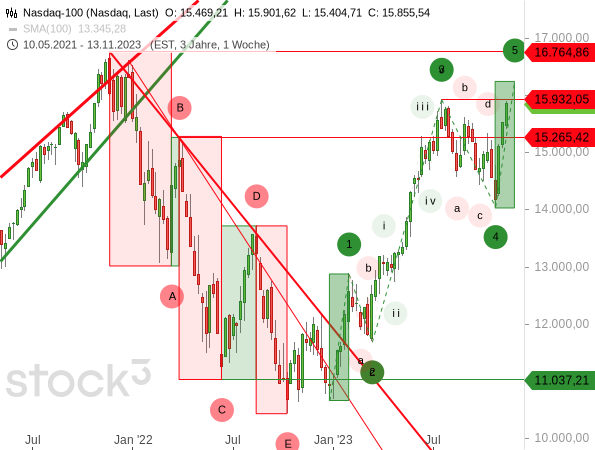 Demnach könnte der Nasdaq 100 auch durchaus schon im Rahmen der aktuellen Welle 3 bzw. deren laufenden Welle 5 sein Rekordhoch vom November 2021 erreichen. Und vielleicht holen die Bullen dann im Rahmen der großen Welle 4 wieder Schwung, um anschließend mit der Welle 5 klar und deutlich auf ein neues Rekordhoch zu steigen.