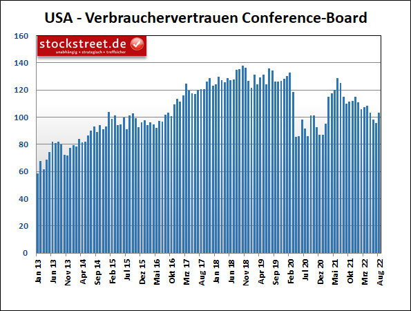 Darauf deuten zumindest die entsprechenden Stimmungsindikatoren hin. Am Dienstag meldete das Conference Board anhand aktueller Umfrageergebnisse, dass das Barometer für die Verbraucherlaune im August auf 103,2 Punkte gestiegen ist, von 95,3 im Juli. Ökonomen hatten lediglich mit einer Verbesserung auf 97,7 Zähler gerechnet. Dabei schätzten die Verbraucher sowohl die aktuelle Lage als auch die Aussichten besser als zuletzt ein.