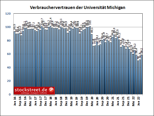 In den USA haben wir es also bei den vorgestern aufgereihten Faktoren, welche es für eine Trendwende am Aktienmarkt vor allem braucht, immerhin mit positiven Inflations- und Verbraucherstimmungsdaten zu tun. Das ist besser als hierzulande, aber auch noch zu wenig. Daher gilt es auch hier, die weitere Entwicklung genau beobachten und auf mehr positive Signale zu hoffen.