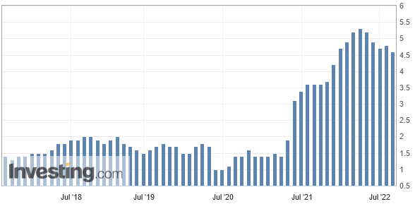 Gleiches gilt für die aktuelle Tendenz bei den Inflationserwartungen, die ebenfalls besser als zunächst gemeldet ausfielen. Statt mit einem Anstieg um 5,0 % rechnen die Konsumenten laut der Uni Michigan für die kommenden 12 Monate mit einer Verteuerung der Waren und Dienstleistungen von „nur“ 4,8 %. Das ist ein relativ großer Rückgang, nachdem die Rate von März bis Juli nur langsam und in kleinen Schritten von 5,4 % auf 5,2 % abgenommen hatte.