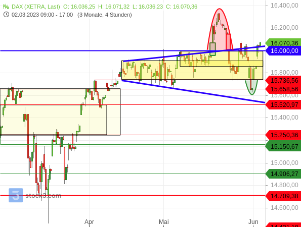 Der DAX konnte sich zum Beispiel von seinem jüngsten Kursrutsch weiter erholen und sich auch wieder über die obere Linie der alten Unsicherheitsformation zurückarbeiten (blau im folgenden Chart), in die er nach der Bullenfalle (roter Bogen) zurückgefallen war.