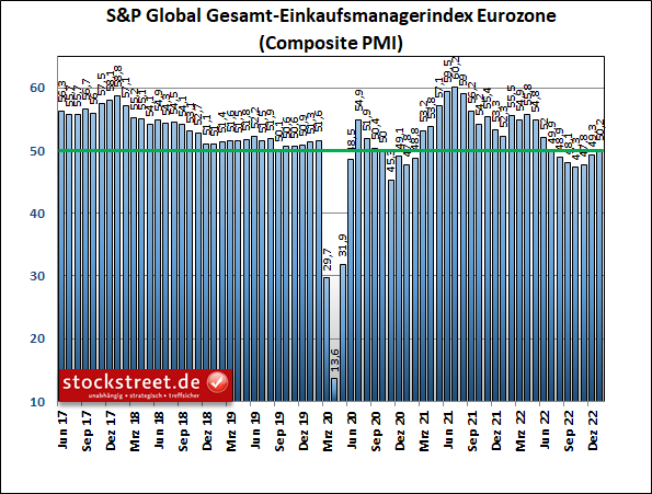Noch besser läuft es für die gesamte Wirtschaft der Eurozone. Auch hier kam es im Januar zum dritten Anstieg des Composite-PMI und einem 7-Monats-Hoch. Mit 50,2 Punkten (+0,9 zum Vormonat) wurde die Wachstumsschwelle aber bereits überschreiten. Experten hatten lediglich einen Wert von 49,8 Zähler erwartet.