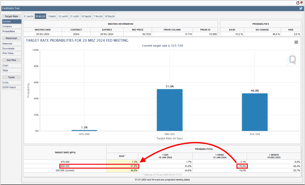 Da war die Zinssenkungs-Euphorie schon fast verflogen: In nur einer Woche ging die vom Markt erwartete Wahrscheinlichkeit einer ersten Zinssenkung im März um satte 25 Prozentpunkte auf nur noch gut 50 % zurück. Gestern Nachmittag, eine gute Stunde vor Eröffnung der US-Märkte lag der Wert nur noch bei 46,0 %, aktuell sind es nur noch 38,6 %.