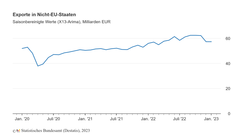 Immerhin: Insgesamt sind die deutschen Exporte in Staaten außerhalb der Europäischen Union (Drittstaaten) im Januar 2023 gegenüber Dezember 2022 kalender- und saisonbereinigt um 0,2 % gestiegen.