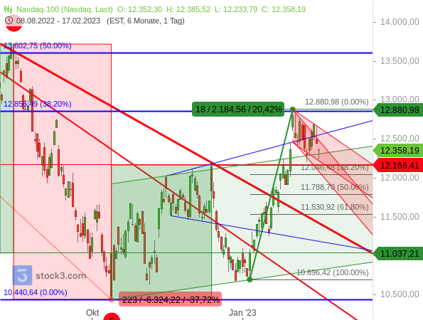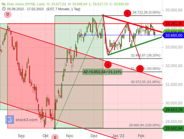 Dabei verhinderte das Hoch vom 16. August 2022 bei 34.281,36 Punkten (Welle D der Bärenmarkt-Korrektur) weitergehende Kursgewinne, während der Index auf der Unterseite immer wieder das Niveau erreichte, welches er bereits am 10. November erreicht hatte (blaue Linie).