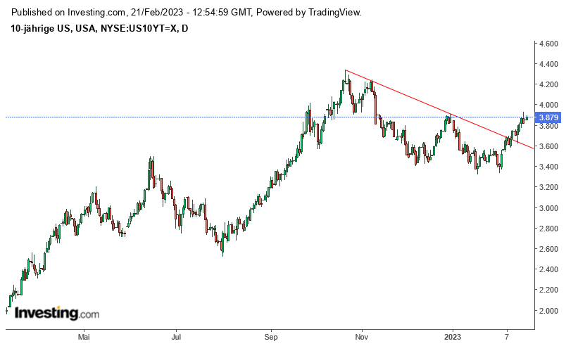 Man könnte das nun womöglich dem typischen Gewöhnungseffekt zuordnen, der sich an den Börsen immer wieder beobachten lässt. Doch an den Devisen- und den Anleihemärkten ließ sich dieser nicht beobachten. Denn dort wurden infolge der Inflationsdaten höhere (Leit-)Zinsen eingepreist. Die Renditen der US-Staatsanleihen haben ihren Abwärtstrend verlassen. Und die 10-Jahres-Rendite hat inzwischen wieder ihr Niveau vom Jahreswechsel erreicht.
