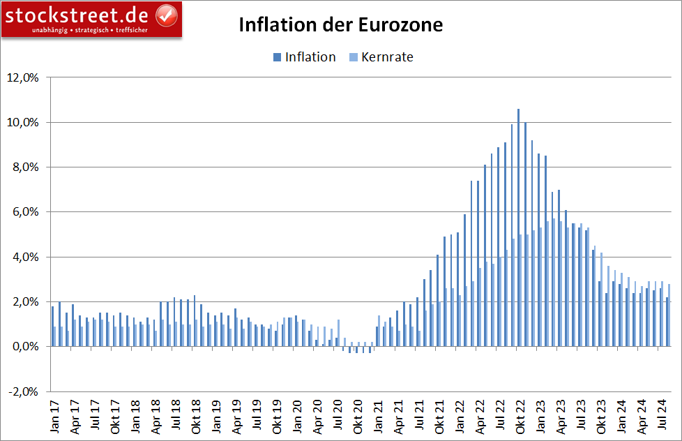 Die Inflationsrate in der Euro-Zone ist im August 2024 auf den niedrigsten Stand seit Juli 2021 gesunken. Waren und Dienstleistungen verteuerten sich nur noch um durchschnittlich +2,2 % im Vergleich zum Vorjahresmonat, wie Eurostat gestern nach einer ersten Schnellschätzung mitteilte. Ökonomen hatten mit diesem Rückgang der Teuerung gerechnet, nachdem sie im Juli noch +2,6 % betragen hatte.