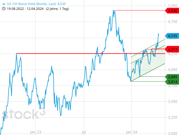 Der Einbruch der Zinssenkungserwartungen als Folge der enttäuschenden US-Inflationsdaten (siehe „Anleger reagieren heftig auf den US-Inflationsschock“) hat tiefe Spuren am Anleihemarkt hinterlassen. Die vielbeachtete Rendite der 10-jährigen US-Staatsanleihe ist nun doch sehr klar aus ihrem Aufwärtstrendkanal nach oben ausgebrochen, nachdem zu Wochenbeginn noch ein Ausbruchsversuch gescheitert war (siehe „Der Bund-Future geht in die erwartete Seitwärtstendenz über“).